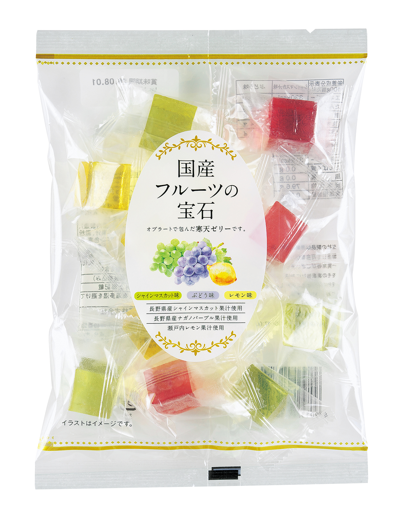 | 原材料名 | [シャインマスカット味]砂糖(国内製造)、水飴、寒天、マスカット果汁、澱粉/ゲル化剤(増粘多糖類、加工デンプン)、酸味料、香料、pH調整剤、着色料(紅花黄、クチナシ)、乳化剤、(一部に大豆を含む) [ナガノパープル味]砂糖(国内製造)、水飴、寒天、ぶどう果汁、澱粉/ゲル化剤(増粘多糖類、加工デンプン)、酸味料、香料、pH調整剤、アントシアニン色素、乳化剤、(一部に大豆を含む) [レモン味]砂糖(国内製造)、水飴、寒天、レモン果汁、澱粉/ゲル化剤(増粘多糖類、加工デンプン)、酸味料、香料、pH調整剤、クチナシ色素、乳化剤、(一部に大豆を含む) |
